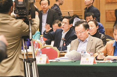 图为张剑飞代表与赖明勇代表在讨论