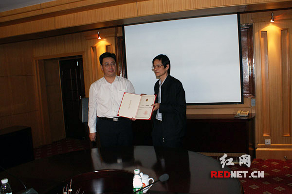 受公安部委托,湖南省公安厅党委委员、纪委书记周赛保[左]为秦希燕[右]颁发聘书。