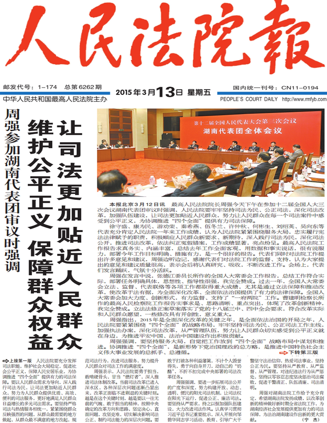 本报北京3月12日讯 最高人民法院院长周强今天下午在参加十二届全国人大三次会议湖南代表团审议时强调,人民法院要牢牢坚持司法为民、公正司法,深化司法改革,加强队伍建设,让司法更加贴近人民群众,努力让人民群众在每一个司法案件中感受到公平正义,为协调推进“四个全面”提供有力司法保障。