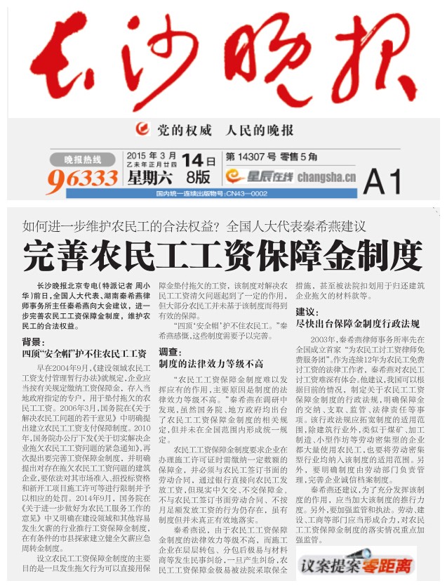 长沙晚报北京专电(特派记者 周小华)前日,全国人大代表、湖南秦希燕律师事务所主任秦希燕向大会建议,进一步完善农民工工资保障金制度,维护农民工的合法权益。